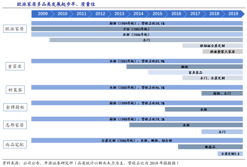 經(jīng)典案例:根據(jù)公司公告、開源證券研究所等綜合資訊表明,歐派家居的多品類發(fā)展起步早、質(zhì)量佳,已經(jīng)形成了強大的“家居多品類矩陣”,形成了強大的“家居品類結(jié)構(gòu)化競爭力”。2018年,歐派廚柜營收占比從 2011 年 的74%下降至 50%,衣柜營收占比從 20%上升至 36%,而其余定制家居品牌的營收仍主要集中于核心單品類,單品類營收占比基本在80%以上,歐派家居多品類發(fā)展起步早、質(zhì)量佳。