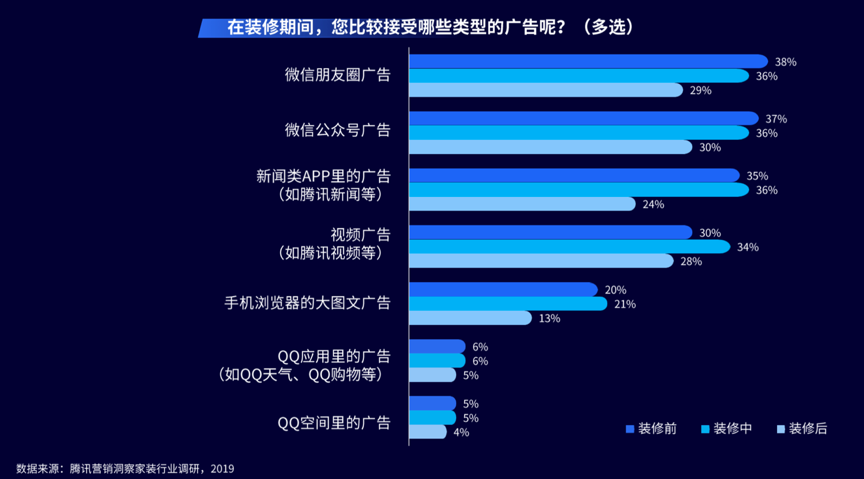 數(shù)字化技術驅動下的家裝新零售電商策劃及傳播,消費者的資訊接受渠道比較“互聯(lián)網(wǎng)化”,尤其依賴于微信朋友圈、公眾號等“品牌私域流量”。 根據(jù)《2019年騰訊營銷洞察家裝行業(yè)調研》等綜合資訊表明,消費者在裝修期間,其比較接受微信朋友圈廣告、微信公眾號廣告和新聞類APP里的廣告、視頻廣告等。