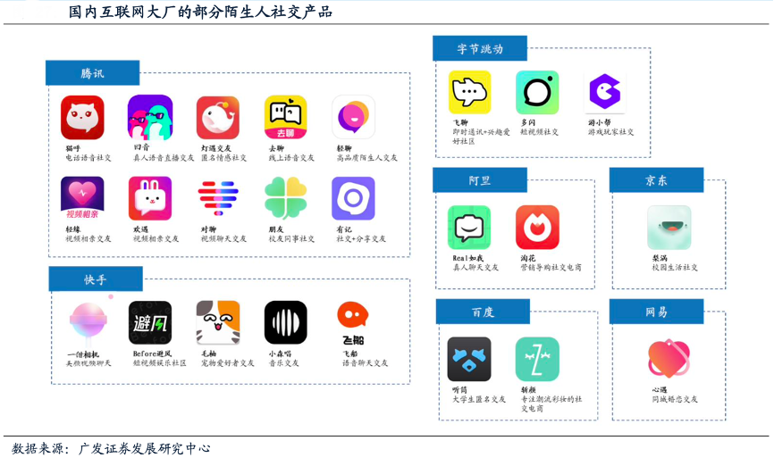 經(jīng)典案例:根據(jù)廣發(fā)證券發(fā)展研究中心等綜合資訊表明,除了目前已在市場(chǎng)中從2019年起到目前為止,已有30多款具有代表性的大廠旗下社交產(chǎn)品上線,包括騰訊、字節(jié)、阿里、快手等大廠。大廠陌生人社交產(chǎn)品切入各細(xì)分賽道,試圖抓住不同社交需求。以騰訊為例,其推出的多款社交產(chǎn)品,分別主打視頻、語(yǔ)音、職場(chǎng)、匿名、相親等賽道。