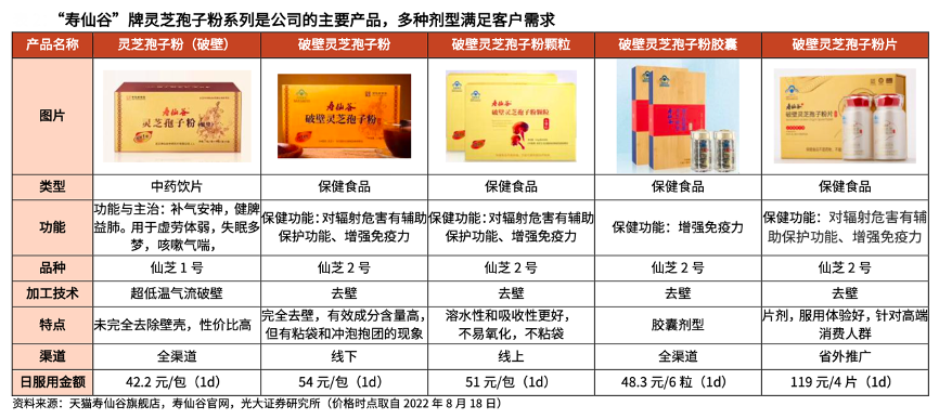 經(jīng)典案例:根據(jù)天貓壽仙谷旗艦店、壽仙谷官網(wǎng)、光大證券研究所等綜合資訊表明,壽仙谷公司的核心產(chǎn)品為第三代靈芝孢子粉,目前靈芝孢子粉類產(chǎn)品收入占營業(yè)收入的 70%左右。“壽仙谷”為公司靈芝孢子粉的主品牌,主要采用了第三代去壁技術(shù),此外還有“武香”、“壽仙草堂”、“武香萬延”等品牌。其中“壽仙谷”面向中高端市場,而“武香”等其他品牌面向中低端市場。