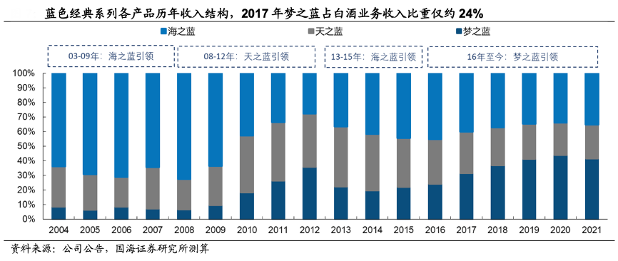 經(jīng)典案例:根據(jù)公司公告、國(guó)海證券研究所等綜合資訊表明,2003年洋河公司主推的“海之藍(lán)”精準(zhǔn)卡位當(dāng)時(shí)市場(chǎng)上幾無(wú)競(jìng)品的 138 元價(jià)格帶,結(jié)合品牌以及渠道端的創(chuàng)新,海之藍(lán)迅速完成泛全國(guó)化,2004-2006 年收入復(fù)合增速約 00%,成為百元價(jià)格帶最大的單品,2017年海/天系列合計(jì)銷售達(dá)百億,公司 300 元以下產(chǎn)品收入占比超75%。
