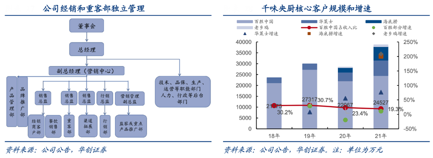 經(jīng)典案例:根據(jù)公司公告、華創(chuàng)證券等綜合資訊表明,千味央廚成立對(duì)接大客戶(hù)的內(nèi)部小組,董事長(zhǎng)和總經(jīng)理為小組負(fù)責(zé)人,營(yíng)銷(xiāo)部門(mén)單獨(dú)設(shè)立重客部,確??焖夙憫?yīng)大客戶(hù)的需求,在具體開(kāi)發(fā)過(guò)程中,公司梳理各餐飲消費(fèi)場(chǎng)景的頭部客戶(hù),自上而下從 TOP3 向 TOP10 拓展新客戶(hù),并成立包括市場(chǎng)、研發(fā)、商務(wù)等專(zhuān)項(xiàng)小組,由專(zhuān)項(xiàng)組與客戶(hù)溝通定向解決問(wèn)題,如千味憑借產(chǎn)品質(zhì)量與成本控制,同 KFC 合作30個(gè)SKU,油條、撻皮供應(yīng)份額分別高達(dá)100%、80%。