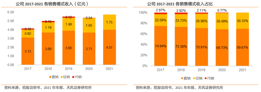 經(jīng)典案例:根據(jù)各公司官網(wǎng)、雙好眼鏡網(wǎng)、億視麗眼鏡網(wǎng)、天風(fēng)證券研究所等綜合資訊表明,分銷售模式看,明月鏡片公司以直銷為主、經(jīng)銷為輔,直銷業(yè)務(wù)模式下包括自有品牌、非自有品牌鏡片、鏡片原料、鏡架和成鏡等眼視 光類產(chǎn)品,2017-2021 收入分別為 3.13/3.69/3.90/3.71/4.01 億元,占主營業(yè)務(wù)比約 70%左右,其中 20/21 年直銷模式中直營電商收入分別為 0.46/0.53 億元,占主營業(yè)務(wù)比為 8.47%/9.19%;公司僅與湖南光合作用合作代銷貼牌鏡片,由于公司全面推行“明月鏡片”品牌戰(zhàn)略,代銷貼牌鏡片業(yè)務(wù)體量顯著下降。