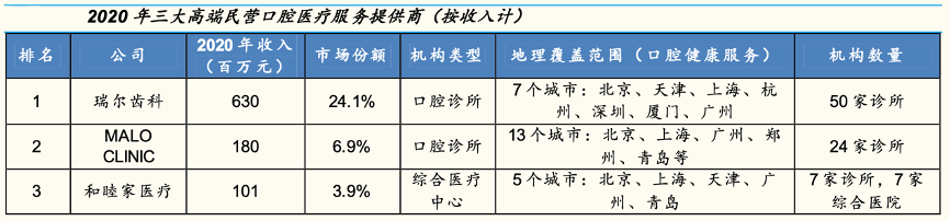 經(jīng)典案例:根據(jù)公司招股說(shuō)明書、國(guó)金證券研究所等綜合資訊表明,瑞爾集團(tuán)公司是高端民營(yíng)口腔醫(yī)療服務(wù)提供商的領(lǐng)軍者。按 2020 年收入計(jì),公司占高端民營(yíng)口腔醫(yī)療服務(wù)市場(chǎng)的24.1%。