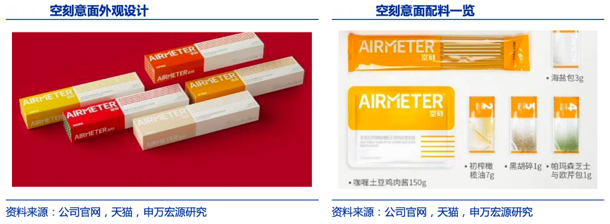 經(jīng)典案例:根據(jù)公司官網(wǎng)、天貓、申萬(wàn)宏源研究等綜合資訊表明,空刻將意面配料拆分成為“意面包”、“醬包”、“橄欖油”、“海鹽”、“黑胡椒碎”、“干酪撒粉“、”歐芹碎”等 6 個(gè)獨(dú)立小袋,復(fù)原做意面的步驟和場(chǎng)景,為制作過(guò)程營(yíng)造了充分的儀式感。在產(chǎn)品包裝方面,區(qū)別于傳統(tǒng)的食 品類(lèi)包裝,空刻設(shè)計(jì)為抽屜長(zhǎng)盒造型,搭配極簡(jiǎn)明亮色塊,以及醒目的英文 Logo,充滿(mǎn) ins 風(fēng)的設(shè)計(jì)風(fēng)格,迎合年輕人審美傾向。