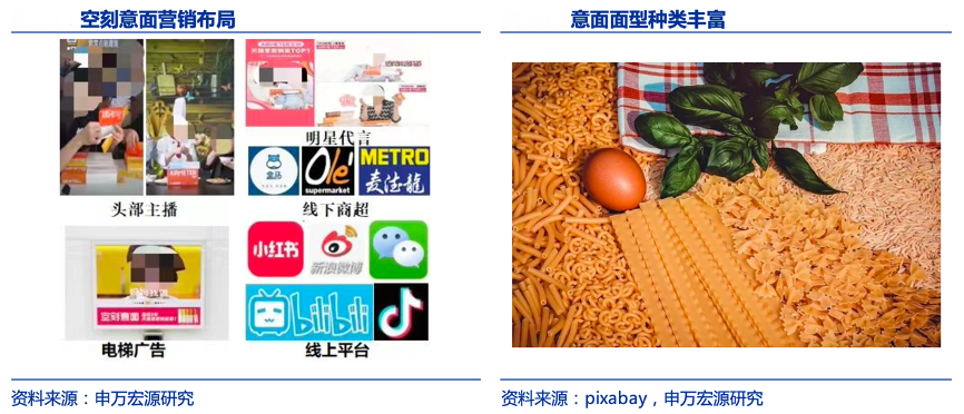 經(jīng)典案例:根據(jù)pixabay、申萬(wàn)宏源研究等綜合資訊表明,空刻依靠經(jīng)典大單品的熱銷(xiāo),迅速實(shí)現(xiàn)品牌的爆火和出圈,并在傳統(tǒng)單品之上,遵循口味的多樣化與面型的延展 2 條主 線,深挖意面賽道潛力,打造意面=空刻的強(qiáng)勢(shì)品牌力,從而迎合消費(fèi)者多樣和多變的飲食消費(fèi)習(xí)慣,為品牌打開(kāi)持續(xù)的成長(zhǎng)空間。
