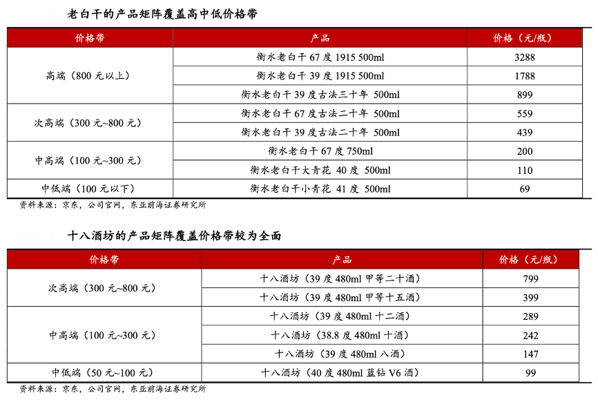 經(jīng)典案例:根據(jù)京東、公司官網(wǎng)、東亞前海證券研究所等綜合資訊表明,老白干系列產(chǎn)品覆蓋中低端及以上價格帶,高端包括1915、古法三十年、甲等二十酒等系列,次高端包括古法二十年、紅五星、甲等十五酒、十二酒等,中高端包括十酒、八酒、大青花等,中低端包括小青花等。
