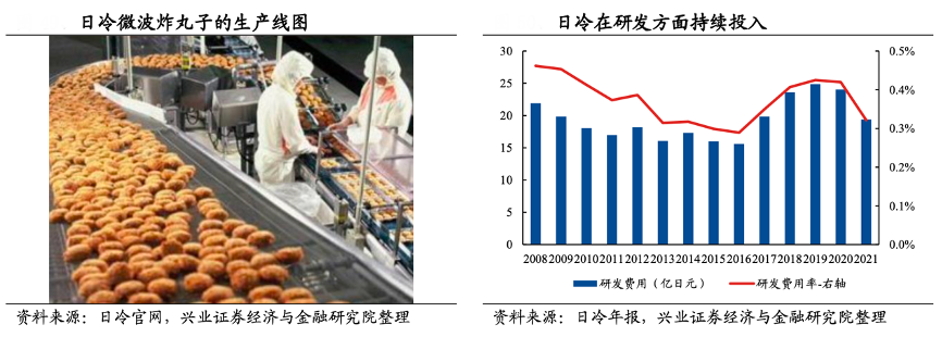 經(jīng)典案例:根據(jù)日冷官網(wǎng)、日冷年報、興業(yè)證券經(jīng)濟與金融研究院等綜合資訊表明,日冷市調(diào)后發(fā)現(xiàn)消費者認為鮮炸丸子味道最佳,但油炸過程繁瑣,于是公司抓住該需求痛點,技術(shù)方面突破了微波后水分的蒸發(fā)也不影響丸子酥脆口感的壁壘,于 1994 年推出微波炸牛肉丸,廣受市場好評。