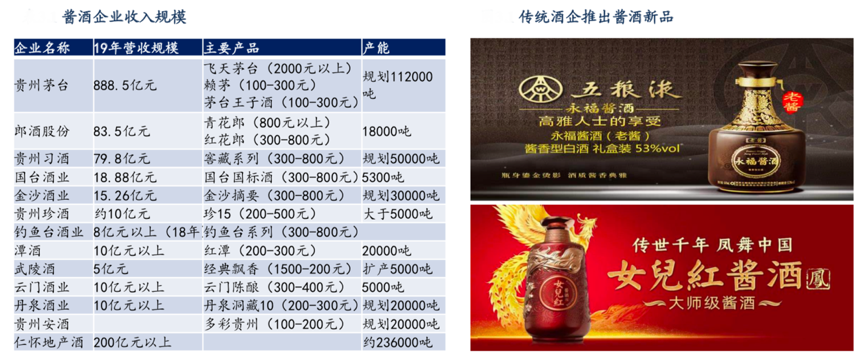 經(jīng)典案例:根據(jù)wind、京東、酒業(yè)家、中國(guó)酒都網(wǎng)、東吳證券研究所等綜合資訊表明,從營(yíng)收規(guī)模來(lái)看,醬酒行業(yè)呈現(xiàn)一超多強(qiáng)的局面。貴州茅臺(tái)為絕對(duì)龍頭,2019年?duì)I收達(dá)888.5億元,郎酒營(yíng)收83.5億元,與習(xí)酒不相上下,位于第二梯隊(duì)。第三梯隊(duì)醬酒企業(yè)如國(guó)臺(tái)、金沙等2019年收入超過(guò)10億元 有打造大單品的潛質(zhì)。同時(shí),以濃香為主的今世緣于2019年推出了“清雅醬香型”的國(guó)緣V9,2015年,五糧液推出15醬,引起業(yè)界關(guān)注。秋糖期間,女兒紅推出醬酒新品,進(jìn)軍醬酒行業(yè)。