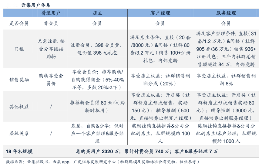 經(jīng)典案例:根據(jù)云集招股書(shū)、云集app、廣發(fā)證券發(fā)展研究中心等綜合資訊表明,除普通購(gòu)買(mǎi)用戶外,云集會(huì)員體系分為三級(jí):即店主→客戶經(jīng)理→服務(wù)經(jīng)理,且平臺(tái)規(guī)定每位店主僅唯一 對(duì)應(yīng)一位客戶經(jīng)理和服務(wù)經(jīng)理。