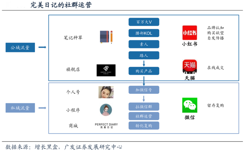 經(jīng)典案例:根據(jù)增長黑盒、廣發(fā)證券發(fā)展研究中心等綜合資訊表明,在小紅書MAU增長趨緩之后,完美日記開始挖掘抖音、淘寶直播、B站等新渠道的 流量價值;公域流量增長放緩之后開始加速私域流量社群運營。2018年下半年開始, 完美日記開始增加其他流量平臺的投放,2018年年底品牌在淘寶直播的轉(zhuǎn)化就超過 了在小紅書的轉(zhuǎn)化。