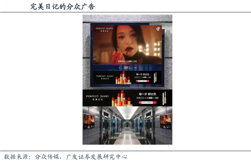 經(jīng)典案例:根據(jù)分眾傳媒、廣發(fā)證券發(fā)展研究中心等綜合資訊表明,配合品牌高端化的節(jié)奏,官宣周迅為代言人之后,完美日記開始加大在分眾上的廣告投放力度,同時2020年以來其線下體驗店費用開始明顯增長。根據(jù)招股說明書數(shù)據(jù),截止2020/9/30,完美日記線下體驗店的數(shù)據(jù)已經(jīng)增至202個。