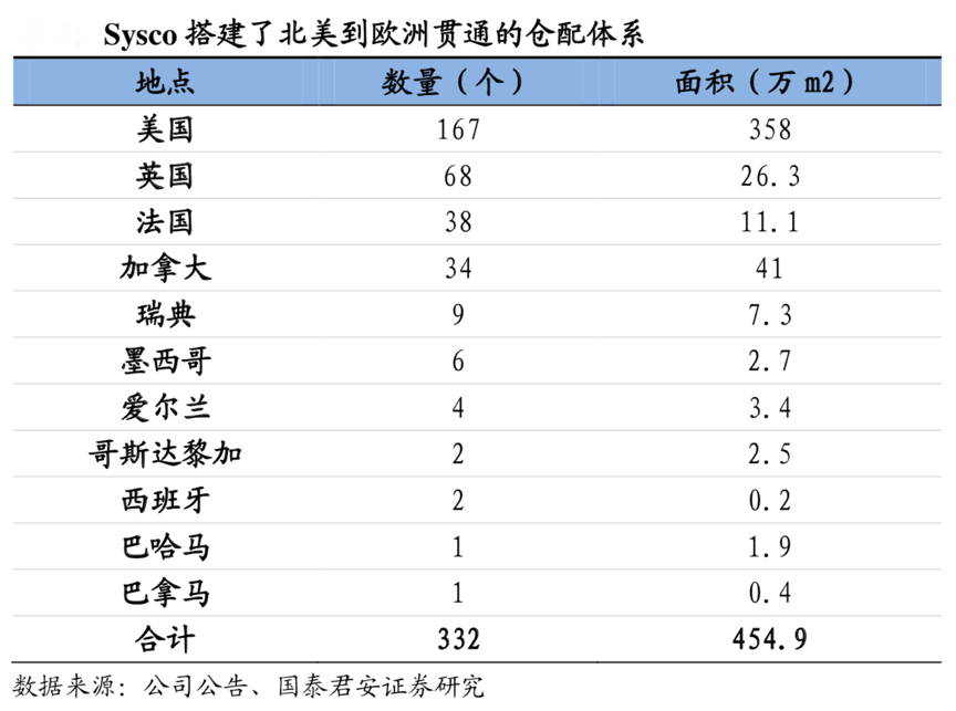 經(jīng)典案例:根據(jù)公司公告、國泰君安證券研究等綜合資訊表明,Sysco自建倉儲物流設(shè)施,打造貫通歐洲、北美的供應(yīng)鏈體系,服務(wù)客戶數(shù)超 60 萬。Sysco 擁有面積達(dá) 4896 萬平方英尺的 332 個配送中心,1.4 萬輛 物流運輸車輛。