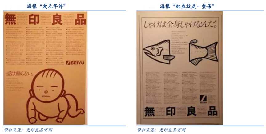 經(jīng)典案例:根據(jù)無印良品官網(wǎng)、華創(chuàng)證券研究等綜合資訊表明,在極簡主義審美下,無印良品在簡化造型的同時,進(jìn)一步簡化生產(chǎn)過程,制造出造型簡潔、樸素且價格適中的商品。1981 年田中一光為無印設(shè)計兩幅海報,其一曰“愛無華飾”,其二 曰“鮭魚就是一整條”,倡導(dǎo)追求事物本質(zhì),摒棄繁雜。
