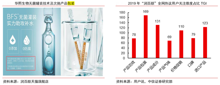 經(jīng)典案例:根據(jù)潤(rùn)百顏天貓旗艦店、用戶說(shuō)和中信證券研究部等綜合資訊表明,潤(rùn)百顏無(wú)菌灌裝技術(shù)(B.F.S)技術(shù)實(shí)現(xiàn)“一次一支一拋”,避免防腐劑以及產(chǎn)品 二次污染,凸顯“實(shí)驗(yàn)室”風(fēng)。其采用國(guó)際領(lǐng)先的 BFS 技術(shù),即吹瓶成型(Blow)+料 液灌裝(Fill)+容器封口(Seal),將每支的灌注量精準(zhǔn)控制在 0.75ml-1.5ml。據(jù)用戶說(shuō)統(tǒng)計(jì),全網(wǎng)熱議用戶 對(duì)“潤(rùn)百顏”產(chǎn)品包裝關(guān)注 TGI 達(dá) 169,大于 100,且遠(yuǎn)高于其他,說(shuō)明用戶在討論“潤(rùn)百顏”產(chǎn)品時(shí),對(duì)其包裝關(guān)注很高。