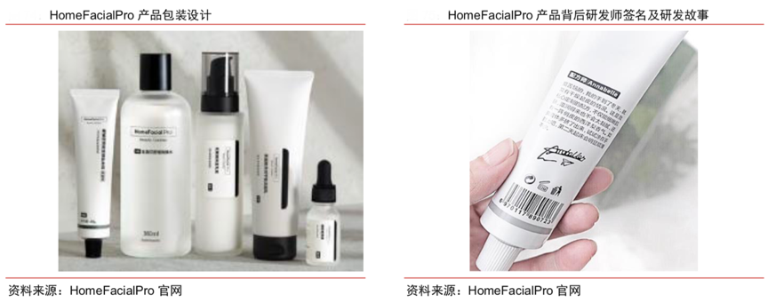 經(jīng)典案例:根據(jù)HomeFacialPro官網(wǎng)、中信證券研究部等綜合資訊表明,HFP 品牌有乳糖酸磨皮、寡肽祛痘、煙酰胺煥白、玻尿酸保濕、肌肽抗糖、蝦青素 抗氧、神經(jīng)酰胺修護(hù)七大系列,產(chǎn)品系列命名即為添加的熱門核心成分。產(chǎn)品包裝以黑白兩色為主,打造極簡(jiǎn)風(fēng)格,且多使用英文元素;產(chǎn)品均通過(guò)上海醫(yī)藥工業(yè)研究院衛(wèi)生部的無(wú)刺激實(shí)驗(yàn)、國(guó)際 SGS 熒光劑檢測(cè)和CNAS實(shí)驗(yàn)室認(rèn)可。
