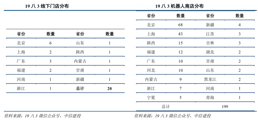 經典案例:根據19 八 3 微信公眾號、中信建投等綜合資訊表明,19 八 3 屬于艾派集團全資子公司,其旗下有 19 八 3 公益概念店、19 八 3 生活館、IP CONCEPT 和 10 八 3 Kids 等品牌。目前在北京、上海、廣東、福建、河南、浙江、山東、陜西、內蒙古、甘肅和新疆共開設 20 家線下零售店;根據 19 八 3 微信客服,在全國 18 個省份共布局 199 家機器人商店,且仍在擴張中。