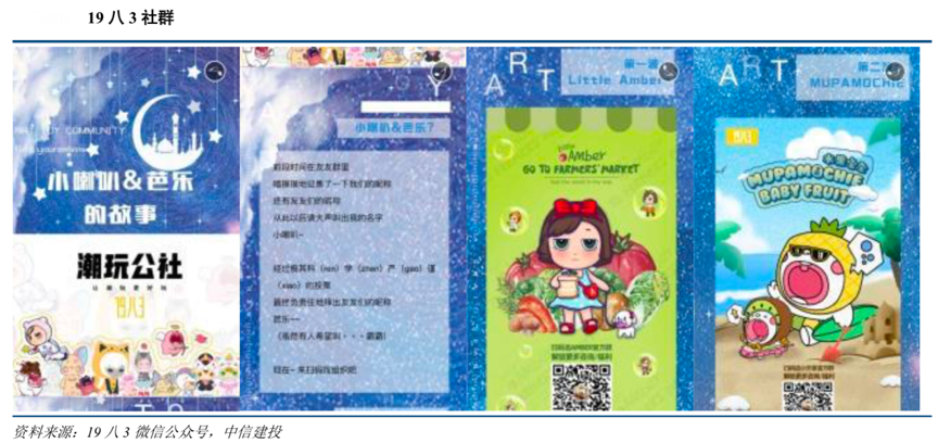 經典案例:根據19 八 3 微信公眾號、中信建投等綜合資訊表明,其于 2018 年在798藝術區(qū)舉辦 ATS 潮玩藝術展,為消費者/粉絲帶去限量發(fā)售作品、抽選發(fā)售作品、one off(只生產一件的產品)和拍賣作品,并在微信上建立社群,其將自己稱為“小喇叭”,將粉絲成為“芭樂”,建立以 Little Amber 和 Mupa Mochie 兩大 IP 為核心的微信群,增加粉絲黏性,同時及時有效地宣傳新品。