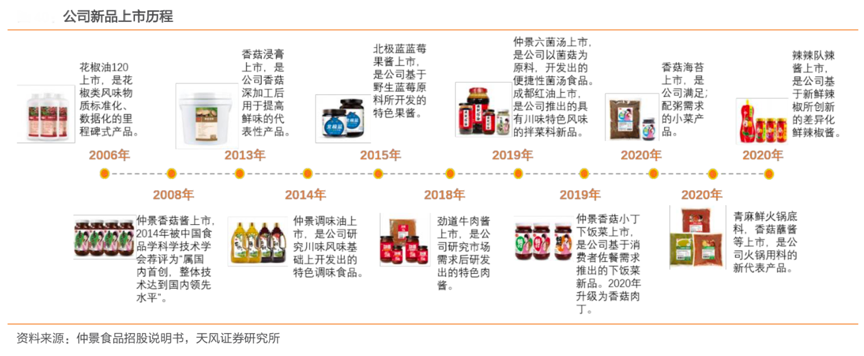 經(jīng)典案例:根據(jù)仲景食品招股說明書、天風(fēng)證券研究所等綜合資訊表明,仲景香菇醬是公司的明星產(chǎn)品,香菇種植加工是當(dāng)?shù)毓舅诘睾幽鲜∥鲘{縣的龍頭產(chǎn)業(yè)。鮮香菇加工為干香菇時留下的香菇柄,因其營 養(yǎng)價值、可加工特性等,成為具有產(chǎn)地優(yōu)勢的特色資源,2008 年,仲景香菇醬上市。2018-2019 年,公司陸續(xù)推出牛肉醬、香菇小丁、藍(lán)莓醬、成都紅油等調(diào)味食品,形成系列化產(chǎn)品組合。