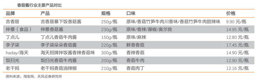 經(jīng)典案例:根據(jù)淘寶網(wǎng)、天風(fēng)證券研究所等綜合資訊表明,仲景擁有“香菇綜合加工利 用技術(shù)”、“線性控溫炒醬技術(shù)”等核心技術(shù),并除原味外開發(fā)出香辣、藤椒、奧爾良等豐富口味, 以適應(yīng)消費者多元化的口味偏好。仲景憑借技術(shù)優(yōu)勢保證產(chǎn)品質(zhì)量,仲景香菇醬價格高于主要產(chǎn)品的平均水平,在消費者追求食品品質(zhì)、傾向于高端化的趨勢下,仲景香菇醬擁有較好的增長潛力。