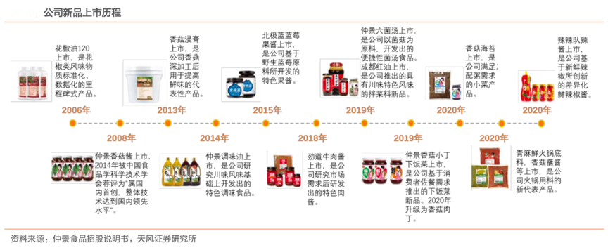 經(jīng)典案例:根據(jù)仲景食品招股說明書、天風證券研究所等綜合資訊表明,自成立以來,仲景食品就不斷推陳出新,2006 年,花椒油 120 上市;2008 年,仲景香菇醬上市;2018-2019 年,其陸續(xù)推出牛肉醬、香菇小丁、藍莓醬、成都紅油等調(diào)味食品,市場反響良好,形成了新的利潤增長點。