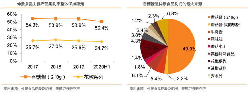 經(jīng)典案例:根據(jù)仲景食品招股說明書、天風證券研究所等綜合資訊表明,從毛利角度看,2020H1調(diào)味食品對主營業(yè)務毛利貢獻率為 66.80%,其中香菇醬(210g) 是公司主營業(yè)務利潤的最大來源,毛利貢獻率達到 49.87%,香菇醬的毛利率趨勢對公司整體有較大影響力。