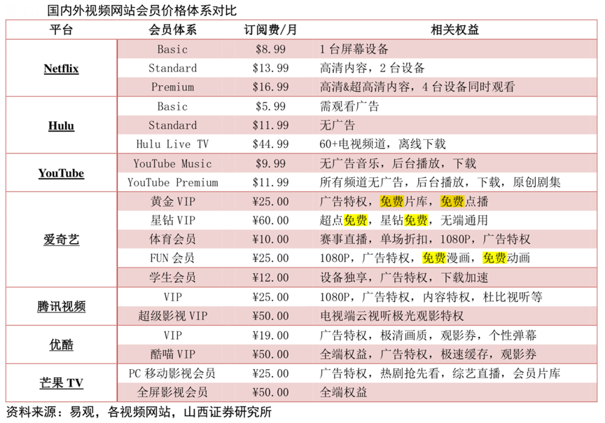 經典案例:根據(jù)易觀、各視頻網站、山西證券研究所等綜合資訊表明,國內外視頻網站平臺的價格策略分為針對C 端用戶 及 B 端內容制作方兩個維度,其中 C 端用戶方面會員提價的通道已經開啟,原因在于付費市場經過長期培育已經形成較為穩(wěn)定的付費群體,會員結構向更高等級遷移側面反映出用戶粘性及付費意愿,用戶群體價格彈性降低能夠為平臺提價奠定基礎。