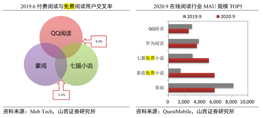 經典案例:根據(jù)Mob Tech、QuestMobile、山西證券研究所等綜合資訊表明,目前市場上頭部的免費閱讀 產品背后均有流量平臺加持,通過一定的拉新模式吸引用戶登錄并以廣告模式進行變現(xiàn)成長迅速, 其中以番茄免費小說為代表的,在字節(jié)系流量與廣告變現(xiàn)系統(tǒng)、智能算法的加持下,番茄免費小說 MAU 規(guī)模從 2020 年初 1700 萬增加至 9 月 5815 萬,躍居免費閱讀 APP 用戶規(guī)模第一。