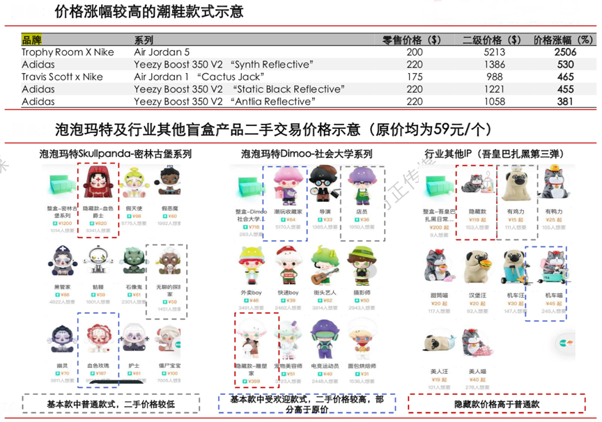 經(jīng)典案例:根據(jù)潮玩族、搜狐、方正證券研究所等綜合資訊表明,泡泡瑪特的產(chǎn)品從設(shè)計(jì)、質(zhì)量、IP知名度等角度較行業(yè)其他產(chǎn)品有一定優(yōu)勢(shì),對(duì)應(yīng)二手交易價(jià)格一般較高,公司通過定期停售、體系內(nèi) 二手交易(葩趣)等方法維護(hù)較好的二級(jí)市場(chǎng)價(jià)格體系。根據(jù)潮玩族數(shù)據(jù) (19年10月至20年10月),每月交易量TOP50的盲盒產(chǎn)品系列中,泡泡瑪特自有/獨(dú)家IP盲盒產(chǎn)品一般超過30個(gè),其交易量占總體比例在50%左右,這意味著買泡泡瑪特的盲盒二手折損 較低、交易便利、且部分款式有升值空間。