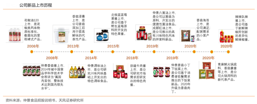 經(jīng)典案例:根據(jù)仲景食品招股說(shuō)明書(shū)、天風(fēng)證券研究所等綜合資訊表明,自成立以來(lái),仲景食品就不斷推陳出新,幾乎每年都會(huì)推出不同品類(lèi)或風(fēng)味的新品,緊隨市場(chǎng)潮流,滿足不同客戶的需求。2006 年,花椒油 120 上市;2008 年,仲景香菇醬上市。2018-2019 年,其陸續(xù)推出牛肉醬、香菇小丁、藍(lán)莓醬、成都紅油等調(diào)味食品,市場(chǎng)反響良好,形成了新的利潤(rùn)增長(zhǎng)點(diǎn)。