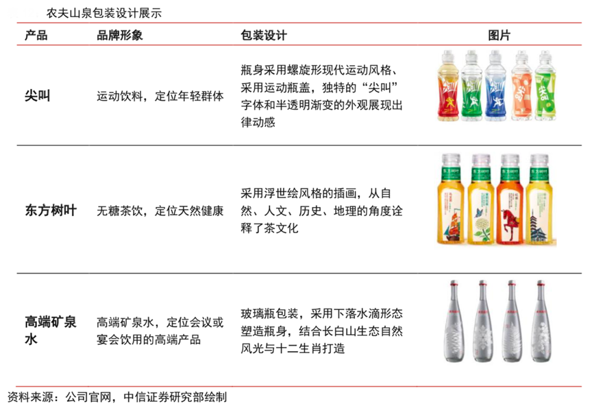經(jīng)典案例:根據(jù)公司官網(wǎng)、中信證券研究部等綜合資訊表明,農(nóng)夫山泉極力通過包裝與其他軟飲料產(chǎn)品形成一定的差異化競爭。以高端礦泉水為例,為了在高端水瓶身設(shè)計(jì)上反映長白山獨(dú)特的生態(tài)文化,農(nóng)夫山泉用 3 年時(shí)間,邀請 30 余個(gè)國家的 5 家設(shè)計(jì)公司,經(jīng)歷 50 余稿。其產(chǎn)品東方樹葉、打奶茶、玻璃瓶礦泉水、運(yùn)動(dòng)裝礦泉水以及維他命水包裝都曾獲得 Pentawards 包裝設(shè)計(jì)獎(jiǎng)(全球首個(gè)專注于包裝設(shè)計(jì)的競賽)。