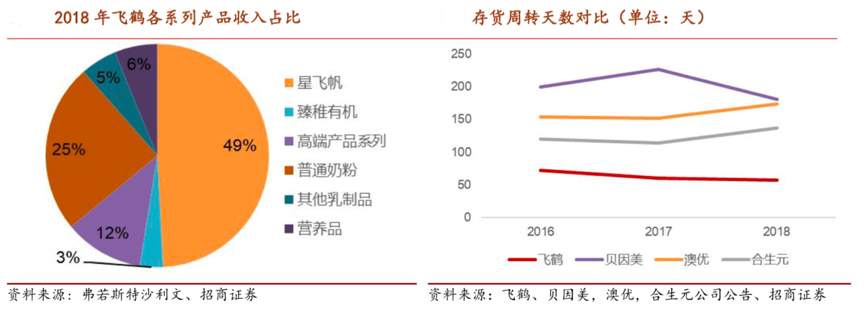 經(jīng)典案例:根據(jù)弗若斯特沙利文、飛鶴、貝因美、澳優(yōu)、合生元公司公告、招商證券等綜合資訊表明,飛鶴靠大單品、強(qiáng)周轉(zhuǎn)模式,突圍奶粉行業(yè)。其產(chǎn)品中超高端星飛帆占比 50%,高端超高端產(chǎn)品占比 75%,通過高舉高打 的模式實現(xiàn)了快速擴(kuò)張。飛鶴存貨周轉(zhuǎn)速度是內(nèi)資龍頭品牌中最快的,存貨周轉(zhuǎn)天數(shù)最 近三年不斷下降,2018 年僅有 57 天。