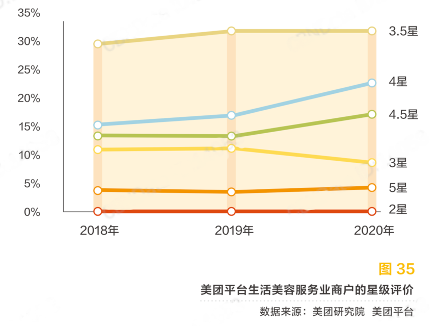 經(jīng)典案例:根據(jù)美團平臺、美團研究院等綜合資訊表明,生活美容服務(wù)業(yè)商戶中 4 星、4.5 星、5 星的高星級商戶占比逐漸上 升,3 星及以下商戶的占比逐漸下降(見圖 35)。分品類來看,用戶評價在 4 星及以上的高 分評價商戶中,紋身商戶占比最高,高分評價占比達(dá)到 68%。