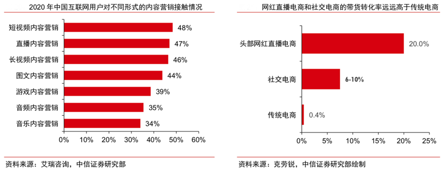 經(jīng)典案例:根據(jù)艾瑞咨詢、克勞銳、中信證券研究所等綜合資訊表明,隨著新媒體的迅速發(fā)展,內(nèi)容電商和社交電商渠道開(kāi)始接力增長(zhǎng),從原來(lái)單一的平臺(tái)電商向分散化的多元電商(如主播帶貨、達(dá)人測(cè)評(píng)、大 V 推薦等)演變,成為小家電的重要新渠道。在用戶觸達(dá)上,互聯(lián)網(wǎng)用戶對(duì) 短視頻內(nèi)容營(yíng)銷、直播營(yíng)銷接觸率均超半數(shù),新興電商傳播力優(yōu)勢(shì)明顯;在用戶轉(zhuǎn)化上,網(wǎng)紅直播電商帶貨轉(zhuǎn)化率以及社交電商轉(zhuǎn)化率遠(yuǎn)高于傳統(tǒng)電商。