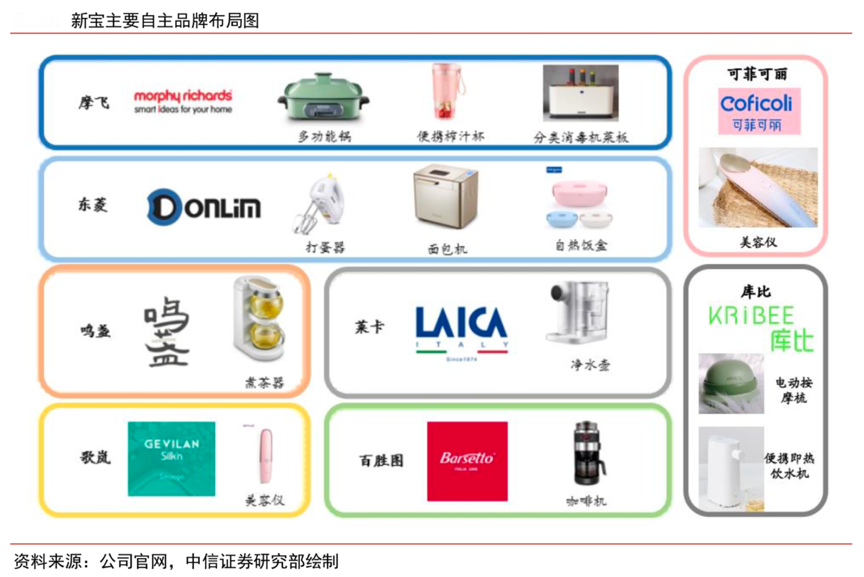 經(jīng)典案例:根據(jù)公司官網(wǎng)、中信證券研究所等綜合資訊表明,新寶搭建起 6 個(gè)覆蓋廚房電器、家用電器、清潔類家電、母嬰電器、個(gè)護(hù)美容電器等不同品類的品牌矩陣,并于2020年下半年新推出 Coficoli、Kribee兩個(gè)瞄準(zhǔn)“Z 世代”年輕群體的新品牌,搭建起專業(yè)化品牌經(jīng)營(yíng)矩陣。