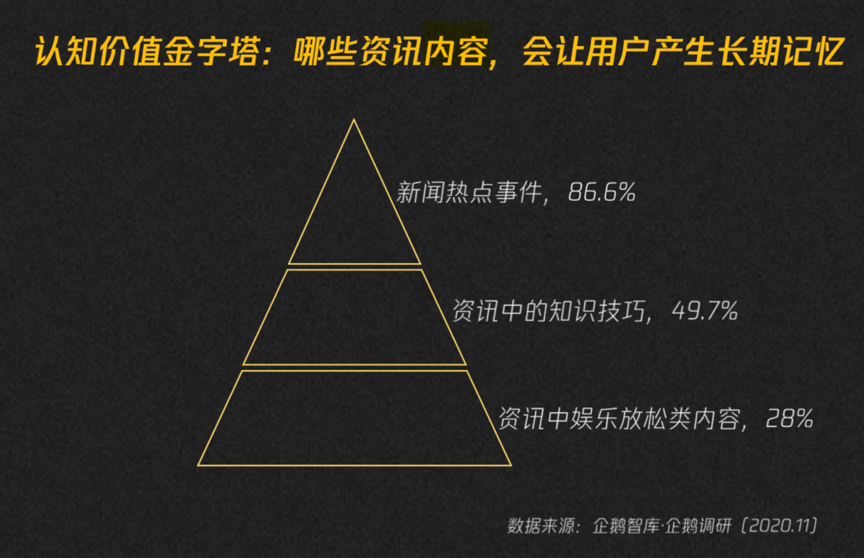 經(jīng)典案例:品牌化傳播內(nèi)容以“泛價(jià)值類內(nèi)容”為主,根據(jù)企鵝智庫等綜合資訊表明,新聞熱點(diǎn)內(nèi)容以86.6%顯著領(lǐng)先,知識(shí)技巧類內(nèi)容處于金字塔的中部,差不多接近50%,而泛娛樂類內(nèi)容則處于金字塔的底部——更多的這方面消費(fèi),可能處于用戶“看完即忘”的狀態(tài)。