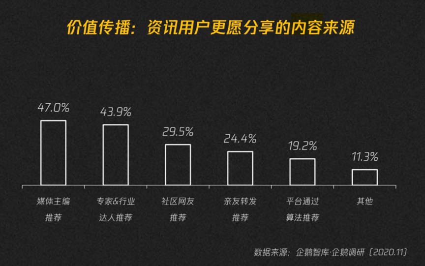 經(jīng)典案例:根據(jù)企鵝智庫等綜合資訊表明,價(jià)值傳播方面,資訊用戶更愿意分享的內(nèi)容來源在于,專業(yè)媒體人、行業(yè)專家達(dá)人、活躍的社區(qū)用戶,都將成為內(nèi)容分發(fā)體系中的多元管道,為用戶帶來豐富的內(nèi)容多樣性和眼界拓展。媒體主編推薦占47%,專家&行業(yè)達(dá)人推薦達(dá)43.9%。