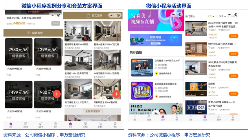 經(jīng)典案例:根據(jù)公司微信小程序、申萬宏源研究等綜合資訊表明,2019 年 12 月,富森美基于微信生態(tài)開發(fā)全新的“富森美在線”小程序,2020年 3 月初小程序上線,線下店鋪入駐達(dá)到 2168 家,線上導(dǎo)購達(dá)到 2.2 萬人。自上線以來到 8 月,僅成都地區(qū)小程序就吸引用戶 80 萬人,實現(xiàn)訂單近 10 萬筆。
