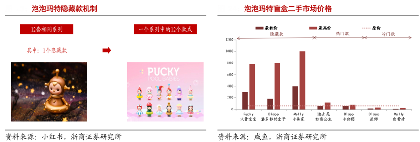 經(jīng)典案例:根據(jù)小紅書、浙商證券研究所等綜合資訊表明,盲盒是潮流玩具的典型 代表,包括基本款和隱藏款,普遍來說一個(gè) IP 系列包括 12 個(gè)款式,共計(jì) 144 個(gè)產(chǎn)品,其中僅 1 個(gè)隱藏款,消費(fèi)者抽中隱藏款的概率為1/144。 “不確定性”的購買機(jī)制賦予其收集、博彩的特征,引導(dǎo)用戶實(shí)現(xiàn)重復(fù)購買、市場也 因此實(shí)現(xiàn)快速成長(數(shù)據(jù)統(tǒng)計(jì)約 70%的潮流玩具消費(fèi)者會(huì)就某一特定設(shè)計(jì)購買盲盒三次或以上)。