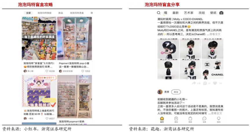經(jīng)典案例:根據(jù)小紅書、葩趣、浙商證券研究所等綜合資訊表明,社交媒體的協(xié)同下,盲盒 IP 快速擴(kuò)圈,形 成潮玩社交鏈;消費(fèi)者在潮玩社交圈獲得身份認(rèn)同感和滿足感,是情感消費(fèi)的落腳點(diǎn)。新品上市 后,在社交媒體上介紹盲盒新品、分享等抽盒技巧;購買到盲盒后,進(jìn)一步發(fā)布拆盒、曬 娃、換娃、改娃圖片視頻等;從而在社交媒體形成相關(guān)話題(2019 年抖音上的盲盒相關(guān) 視頻播放量達(dá) 8.4 億),吸引普通玩家“入坑”。