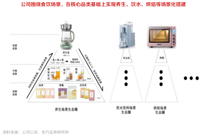 經(jīng)典案例:根據(jù)公司公告、東方證券研究所等綜合資訊表明,北鼎股份公司主打核心品類基礎(chǔ)上的場(chǎng)景化搭建,即基于養(yǎng)生壺等廚房小家電品類,縱向拓展至周邊用品及周邊食材,通過低頻消費(fèi)(廚房小電)+中頻消費(fèi)(周邊用品)+高頻消費(fèi)(周邊食材)的產(chǎn)品組合打造養(yǎng)生場(chǎng)景; 橫向角度積極開發(fā)飲水機(jī)、烤箱等品類產(chǎn)品線,構(gòu)造對(duì)應(yīng)的桌面健康飲水飲料、烘焙等場(chǎng)景。