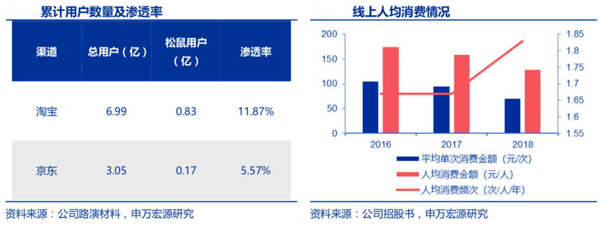 經(jīng)典案例:根據(jù)公司路演材料、公司招股書、申萬宏源研究等綜合資訊表明,截至 2019 H1,三只松鼠公司在淘寶平臺(tái)累計(jì)用戶為 0.83 億人次,滲透率為 11.87%,在京東平臺(tái)累計(jì)用戶為 0.17 人次, 滲透率為 5.57%。2018 年,公司線上用戶人均購買頻次為 1.83 次/年,平均單次消費(fèi)金額為 69.59 元。16-18 年,隨著線上品類布局更加豐富,復(fù)購率更高的烘焙類等產(chǎn)品發(fā)力,帶動(dòng)購買頻次總體呈上升趨勢(shì)。