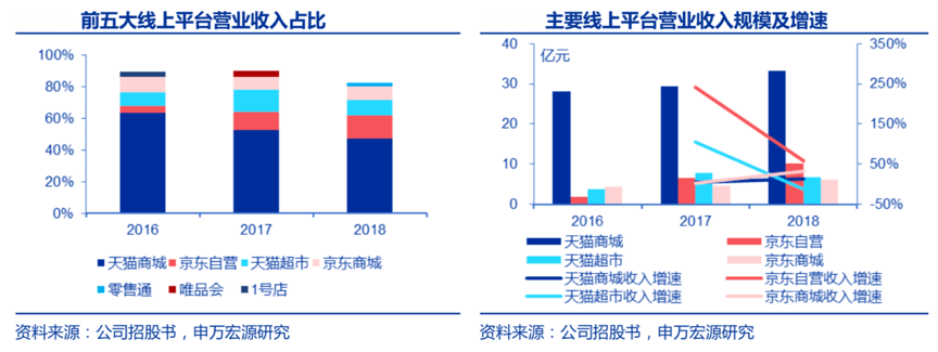 經(jīng)典案例:根據(jù)公司招股書、申萬宏源研究等綜合資訊表明,三只松鼠線上銷售模式主要包括在第三方平臺(tái)開展的 B2C 模式(天貓商城、京東商城等)、統(tǒng)一入倉模式(天貓超市、京東自營等)、以及自營手機(jī)APP。根據(jù)招股說明書披露 18年數(shù)據(jù),天貓商城及京東自營店為公司收入貢獻(xiàn)前兩大平臺(tái),占比分別為 47.4%、14.6%。