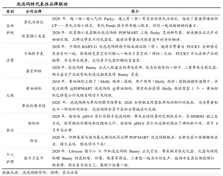 經(jīng)典案例:根據(jù)泡泡瑪特官網(wǎng)、微博和東北證券等綜合資訊表明,泡泡瑪特泡泡瑪特自 2018 年開(kāi)始全面開(kāi)展授權(quán)業(yè)務(wù),合作品牌數(shù)已超過(guò) 15 家,其中包括歐萊雅、德芙、芬達(dá)、旁氏、IPSA、味可滋、娃哈哈等各行業(yè)領(lǐng)軍品牌。泡泡瑪特在選擇合作對(duì)象時(shí),主要以契合潮玩 用戶特性的女性向、年輕化消費(fèi)、文娛品牌為主,2020年,泡泡瑪特通過(guò)與德芙、歐萊雅等品牌的 IP 合作獲得 6600 萬(wàn)元的 IP 授權(quán)費(fèi)收入。