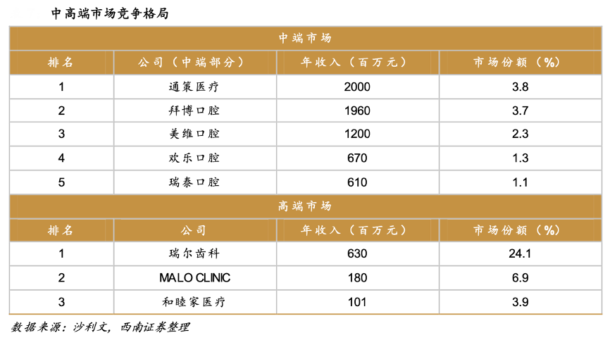 經(jīng)典案例:根據(jù)沙利文、西南證券等綜合資訊表明,成立于 1999 年的瑞爾齒科,主要針對(duì)一線城市中具有高購買力和較高終身價(jià)值的富?;颊?,因此其大部分診所位于商業(yè)核心區(qū)域和甲級(jí)寫字樓,憑借卓越的口腔醫(yī)療服務(wù)質(zhì)量和患者護(hù)理來獲取較高的客單價(jià)。2012 年,公司成立瑞泰口腔,主要針對(duì)一線城市和核心二線城市的中產(chǎn)階層消費(fèi)者,通過以更實(shí)惠的價(jià)格提供高質(zhì)量的口腔醫(yī) 療服務(wù),占領(lǐng)更大的中端口腔醫(yī)療服務(wù)市場(chǎng)。