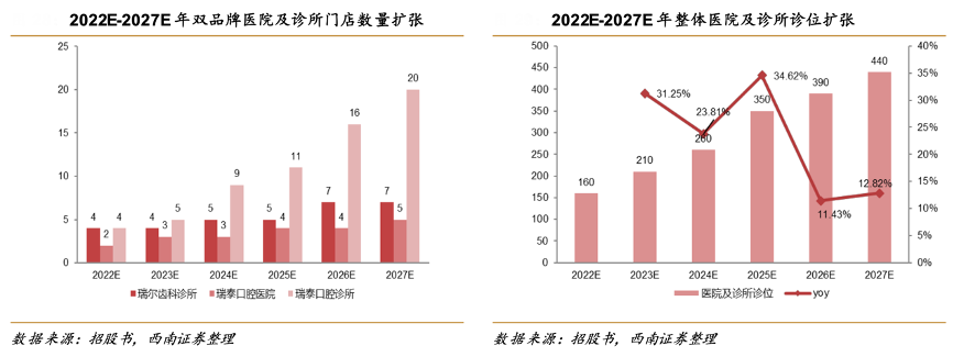 經(jīng)典案例:根據(jù)招股書、西南證券等綜合資訊表明,瑞爾齒科著力發(fā)展診所業(yè)務(wù),瑞泰口腔預(yù)計(jì)診所和醫(yī)院擴(kuò)張同時(shí)開展,瑞爾齒科未來 5 年計(jì)劃擴(kuò)展的診所數(shù)量 4-7 家低于瑞泰口腔 4-20 家,公司未來醫(yī)院擴(kuò)張預(yù)計(jì)每年為 2-5 家,主營業(yè)務(wù)集中在診所的擴(kuò)張,瑞爾齒科和瑞泰口腔分別總計(jì)在 5 年內(nèi)擴(kuò)張 32 和 65 家診所。