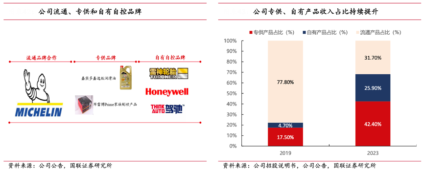 經(jīng)典案例:根據(jù)公司公告、公司招股說(shuō)明書、國(guó)聯(lián)證券研究所等綜合資訊表明,途虎公司專供、自有品牌占比持續(xù)提升,公司在低線城市推自有品牌更加便捷。截至 2023Q1,途虎推出了 51 個(gè)自有品牌并于過(guò)去 12 個(gè)月通過(guò)途虎平臺(tái)交易了 7429 個(gè) SKU。