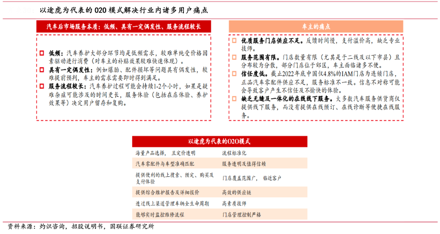 經(jīng)典案例:根據(jù)灼識(shí)咨詢、招股說(shuō)明書、國(guó)聯(lián)證券研究所等綜合資訊表明,以途虎為代表的 O2O 模式解決汽車后市場(chǎng)諸多用戶痛點(diǎn)。O2O 汽車服務(wù)模式將線 上平臺(tái)及線下門店的優(yōu)點(diǎn)相結(jié)合,線上平臺(tái)為線下運(yùn)營(yíng)提供龐大的客戶流量及數(shù)據(jù) 分析;線下門店與集中式供應(yīng)鏈系統(tǒng)合作,采用統(tǒng)一的數(shù)字化客戶管理及訂單系統(tǒng), 并且線下門店受到平臺(tái)的實(shí)時(shí)嚴(yán)格管控。