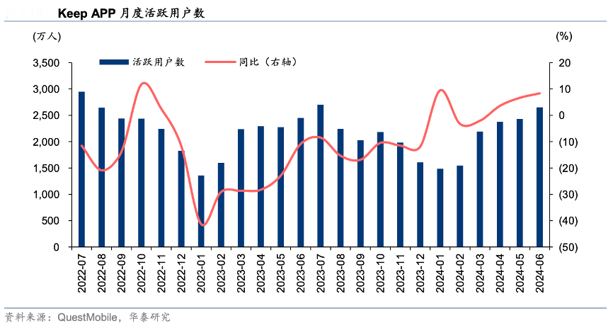 經(jīng)典案例:根據(jù)QuestMobilr、華泰研究等綜合資訊表明,邁入 2024 年后,隨著Keep公司持續(xù)深化 健身內(nèi)容布局,如發(fā)起與頭部 KOL 合作推出 PUGC 課程、持續(xù)推出虛擬體育賽事等線上付費(fèi)內(nèi)容等舉措,用戶側(cè)數(shù)據(jù)正逐步邁向健康的內(nèi)生增長軌道。據(jù) QuestMobile 數(shù)據(jù),至 2024 年 6 月 APP 月度活躍用戶數(shù)已達(dá) 2,653 萬人,同比+8.4%,整體用戶規(guī)模增速呈現(xiàn)逐步向好趨勢。