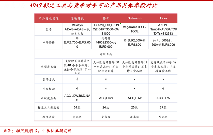 經(jīng)典案例:根據(jù)招股說明書、中泰證券研究所等綜合資訊表明,道通科技公司 ADAS 產(chǎn)品較早進入市場,其與可比公司博世、Gutmann、Texa 等可比公司產(chǎn)品相比,車型、系統(tǒng)覆蓋面較廣,操作更便捷。以公司標定工具 ADAS 一代標定主架為例,產(chǎn)品支持歐美日韓等主流 48 個車系品牌,標定工具覆蓋面包含 54 款,系統(tǒng)覆蓋面顯著優(yōu)于可比公司;引導方式和圖文提示更便捷,擁有較好的客戶體驗。